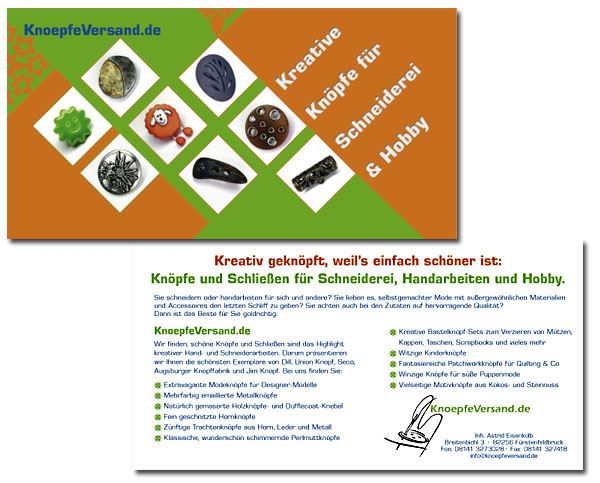 Auch kreative Knöpfe für Schneiderei und Hobby wollen schick präsentiert werden. Eine Aktionskarte ist für diesen Einsatz ideal: Hinterlässt sie doch einen starken Eindruck zum kleinen Preis. Der Trick für besonders gewiefte Onlinehändler: Legen Sie stets drei Karten mit ins Paket. Eine behält der Kunde für sich. Die beiden anderen sind für dessen gute Freunde. Eine hübsch gemachte Karte prägt sich nämlich viel besser ein, als ein Zettel mit einer eilig notierten Internetadresse.