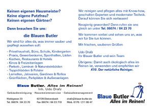 Die Blauen Butler kommen regelmäßig viel herum. Was liegt näher, als bei dieser Gelegenheit Aktionskarten als überdimensionierte Visitenkarte in die Briefkästen potenzieller Kunden zu stecken? Zumal in diesem Fall potenzielle Kunden nah beinander in den Gewerbegebieten liegen. Gesagt getan: